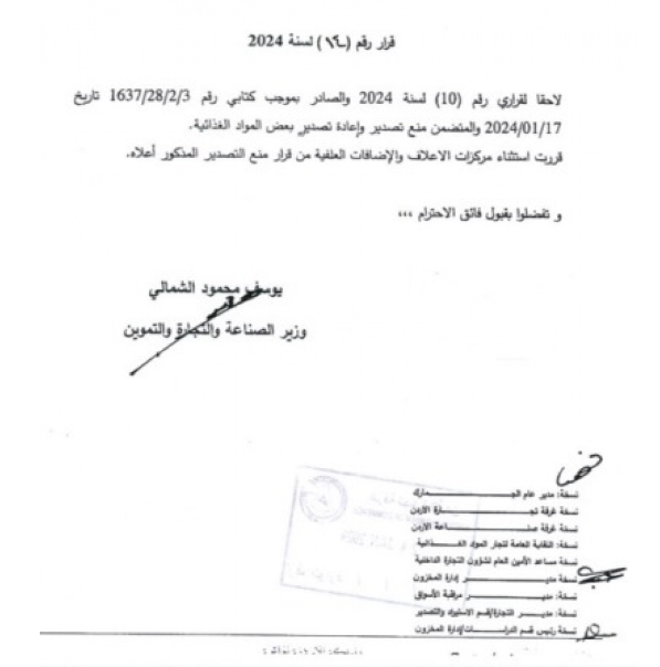 ووفقًا لما جاء في تعميم صدر عن الوزير يوسف الشمالي، "لاحقًا لقراري رقم (10) لسنة 2024 (...)، والمتضمن منع تصدير وإعادة تصدير بعض المواد الغذائية. قررت استثناء مركزات الأعلاف والإضافات العلفية من قرار منع التصدير".