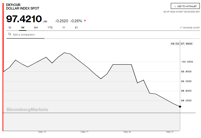 وتراجع مؤشر الدولار بنحو ملحوط بنسبة 3% من مستوى ذروة الشهر الماضي، حيث بلغ في 14 مايو الماضي 100.466 نقطة.