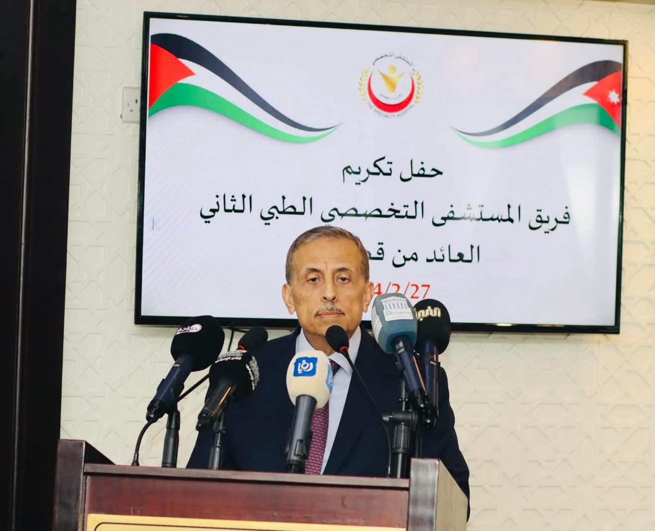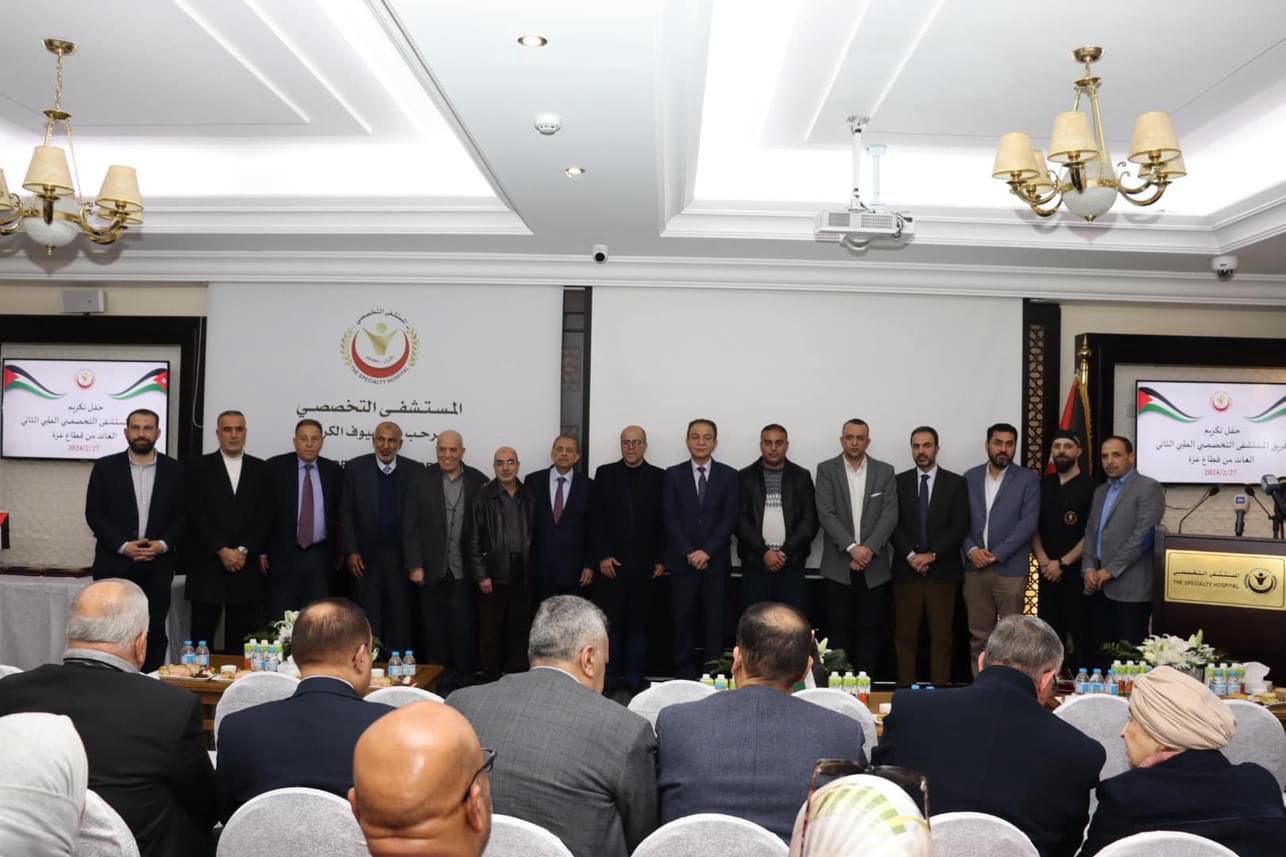 تم اليوم الثلاثاء الموافق 27-2-2024 في المستشفى التخصصي اقامة حفل تكريم للفريق الطبي الثاني العائد من غزة والذين عادوا إلى أرض الوطن بعد أدائهم لواجب مساندة أشقائهم الأطباء والممرضين العاملين في مستشفيات القطاع ومعالجة أكبر عدد ممكن من الجرحى، بدعوة من الدكتور فوزي الحموري مدير عام المستشفى التخصصي وبحضور نقيب الأطباء الأردنيين الدكتور زياد الزعبي ورئيس جمعية المستشفيات الخاصة الدكتور نائل المصالحة، ونقيب أطباء الأسنان الدكتور عازم القدومي ونقيب الممرضين السيد خالد الربابعة وعدد كبير من الأطباء والكوادر الصحية.