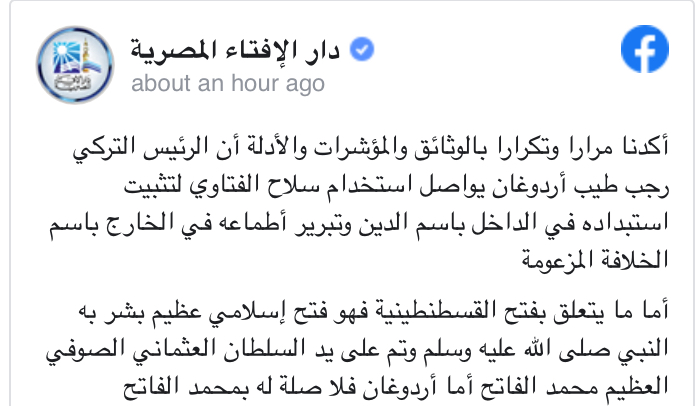 الإفتاء المصرية: أردوغان لا صلة له بفتح القسطنطينية