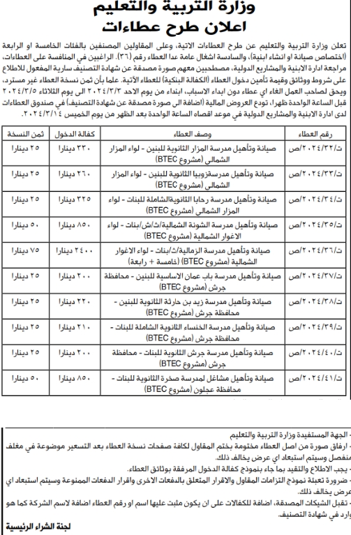 أعلنت وزارة التربية والتعليم عن طرح عطاءات؛ لصيانة مجموعة من المدارس في لواء الأغوار الشمالية، جرش، عجلون، لواء المزار الشمالي .
