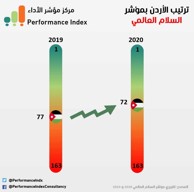 أظهرت القراءة التحليلية الصادرة عن مركز مؤشر الأداء لتقريرمؤشر السلام العالمي الذي يعده معهد الاقتصاد والسلام الدولي تقدم الأردن 5 مراكز عالميا خلال عام 2020 مقارنة بالعام 2019. الأردن جاء بالمرتبة الـ 72 عالميا و الخامسة عربيا بعد كل من قطر و الكويت والامارات وعمان.