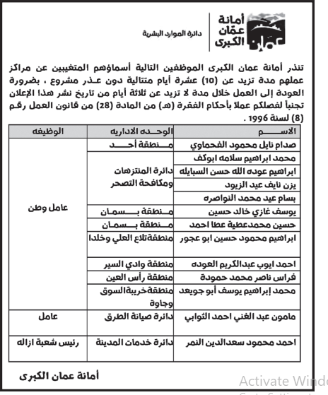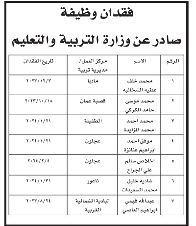 أعلنت وزارة التربية والتعليم وأمانة عمان الكبرى عن أسماء موظفين فاقدين لوظائفهم :