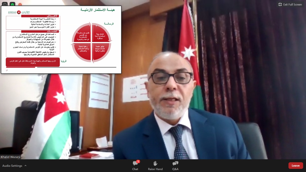 وخلال اللقاء تم استعراض أهم الفرص الاستثمارية الواعدة في الأردن، ومناخ وبيئة الأعمال والاستثمار إضافة إلى الدور الذي قامت به الحكومة الأردنية وهيئة الاستثمار في التعامل مع جائحة كورونا والخطط المستقبلية في الترويج وجذب وتمكين الاستثمار.