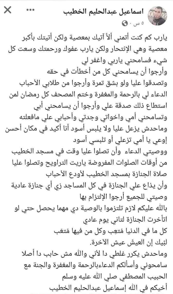وتدوال مدونون على مواقع التواصل الاجتماعي وصية نشرها إسماعيل على صفحته "فيسبوك" قبل إنهاء حياته وجاء فيها: "يارب كم كنت أتمنى ألاّ آتيك بمعصية ولكن أتيتك بأكبر معصية وهي الانتحار ولكن يارب عفوك ورحمتك وسعت كل شيء فسامحني ياربي واغفر لي، وأرجو أن يسامحني كل من أخطأت في حقه، وتصدقوا عليا ولو بشق تمرة وأرجو من طلابي الأحباب الدعاء لي بالرحمة والمغفرة وختم المصحف كل رمضان لمن استطاع ذلك صدقة علي وأرجو أن يسامحني أبي وتسامحني أمي وأخواتي وجدتي وأحبابي على مافعلته وماحدش يزعل عليا ولا يلبس أسود، أنا أكيد في مكان أحسن إوعي يا أمي تزعلي أو تلبسي أسود".
