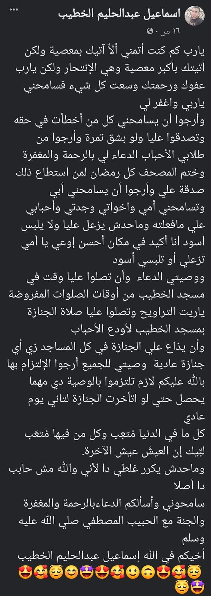 وأفاد في وصيته: "لبّيك إن العيش عيش الآخرة، وماحدش يكرر غلطي دا لأني والله مش حابب دا أصلا، سامحوني وأسألكم الدعاء بالرحمة والمغفرة والجنة مع الحبيب المصطفى صلى الله عليه وسلم".