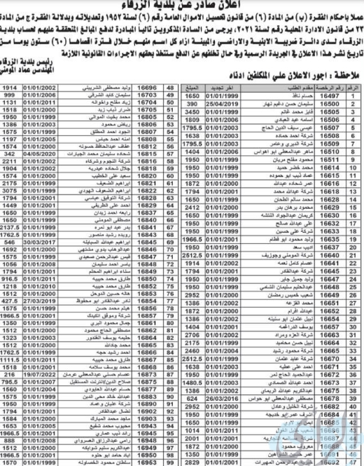 بلدية الزرقاء تنشر أسماء مواطنين ترتبت عليهم مبالغ مالية