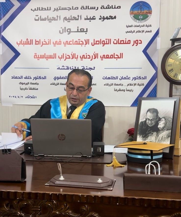 ناقش الزميل محمود الحياصات ، اليوم الثلاثاء، رسالة الماجستير في جامعة الزرقاء الخاصة الموسومة ب " دور منصات التواصل الاجتماعي في انخراط الشباب الجامعي الأردني بالأحزاب السياسية" ، تحت إشراف الدكتور عثمان الطاهات .