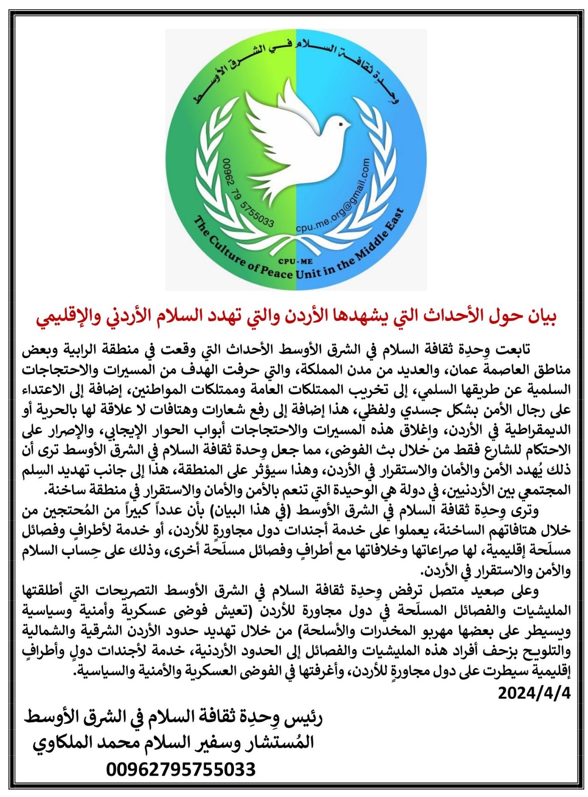 وأكد رئيس وِحِدة ثقافة السلام في الشرق الأوسط المستشار وسفير السلام محمد الملكاوي بأن الوِحِدة ترى في بيانها بأن هذه الاحتجاجات والمسيرات الفوضوية أصبحت تُهدد الأمن والأمان والاستقرار في الأردن، مما سيؤثر أيضاً على السلام والأمن في المنطقة، هذا إلى جانب تهديد السِلم المجتمعي بين الأردنيين، في دولة هي الوحيدة التي تنعم بالأمن والأمان والاستقرار في منطقة ساخنة وملتهبة تحيط بها.