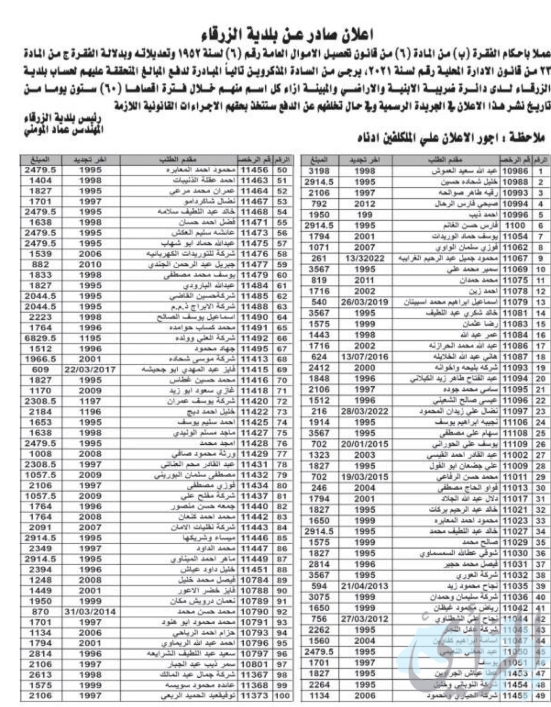 بلدية الزرقاء تنشر أسماء مواطنين ترتبت عليهم مبالغ مالية