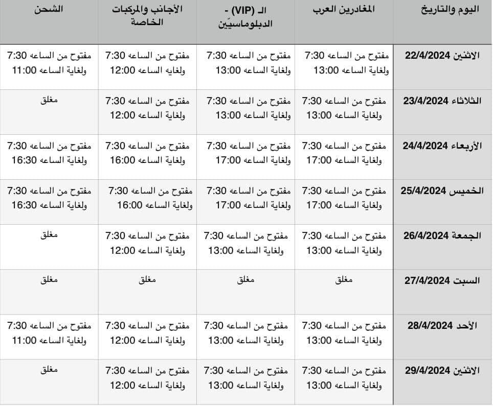 أعلنت إدارة أمن الجسر عن تعديل أوقات عمل جسر الملك؛ اعتبارا من تاريخ 22 إلى 29 نيسان الحالي.وقالت الإدارة إن عودة حركة الجسر كالمعتاد وكما هو معمول به حاليا، بحيث يصبح عمل الجسر من الساعة 7:30 صباحا إلى الساعة السادسة مساء؛ اعتبارا من يوم الاثنين الموافق 30 نيسان الحالي.ودعت الإدارة جميع المسافرين المغادرين باتجاه الضفة الغربية الحضور إلى جسر الملك حسين قبل موعد الإغلاق بساعة.