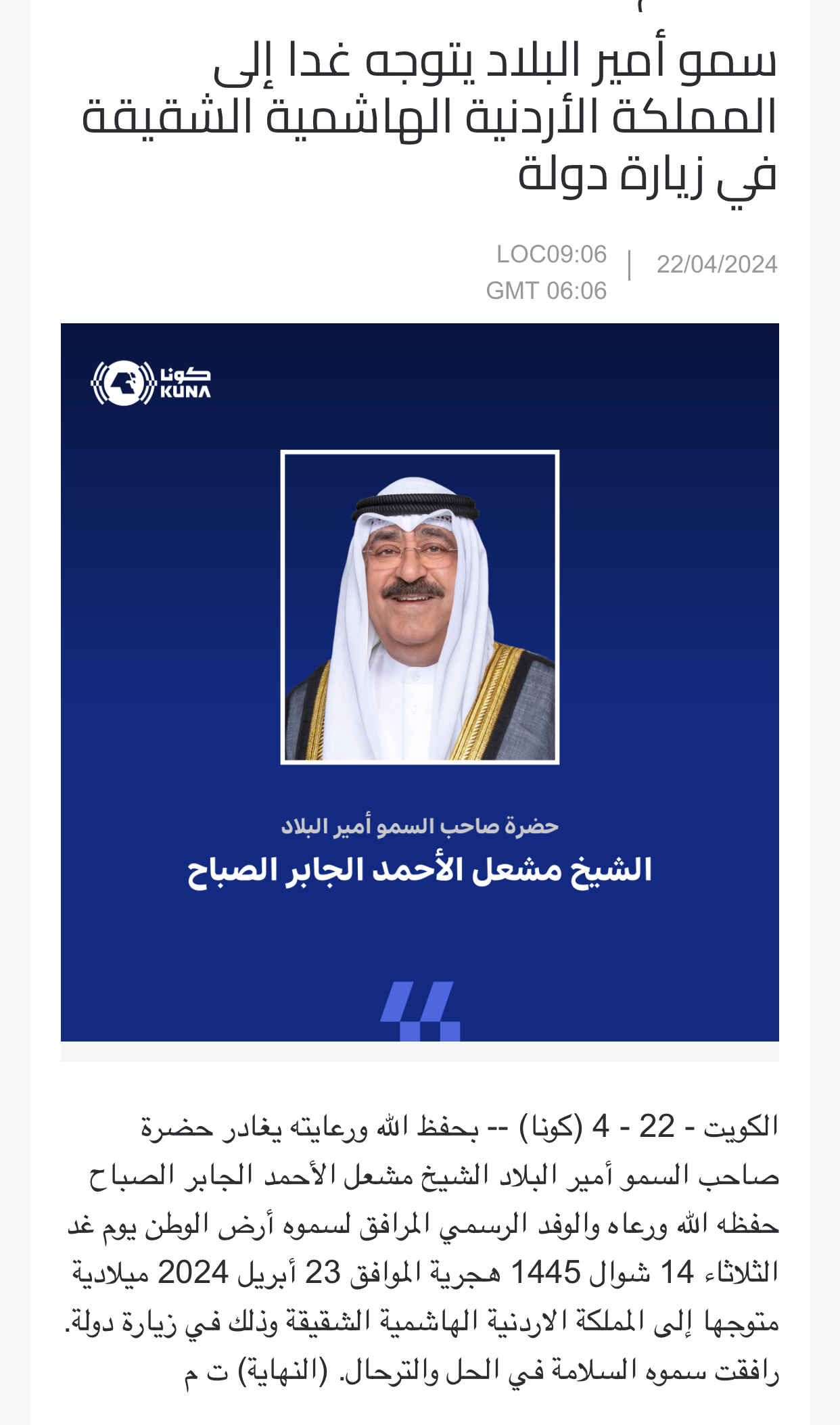 ذكرت وكالة الأنباء الكويتية الرسمية "كونا"، الإثنين، أن أمير البلاد الشيخ مشعل الأحمد الجابر الصباح، سيغادر أرض الوطن غدا الثلاثاء متوجها إلى الأردن في زيارة رسمية .