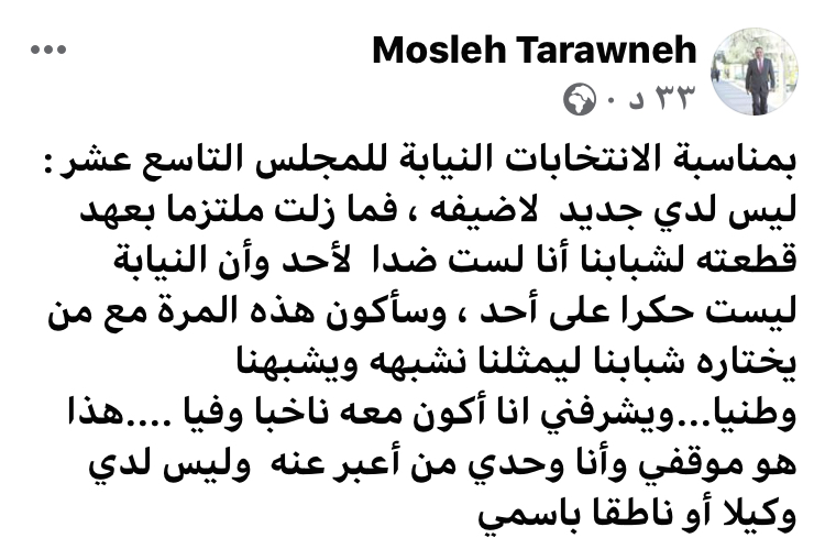بمناسبة الانتخابات النيابة للمجلس التاسع عشر : ليس لدي جديد لاضيفه ، فما زلت ملتزما بعهد قطعته لشبابنا أنا لست ضدا لأحد وأن النيابة ليست حكرا على أحد ، وسأكون هذه المرة مع من يختاره شبابنا ليمثلنا نشبهه ويشبهنا وطنيا…ويشرفني انا أكون معه ناخبا وفيا ….هذا هو موقفي وأنا وحدي من أعبر عنه وليس لدي وكيلا أو ناطقا باسمي.