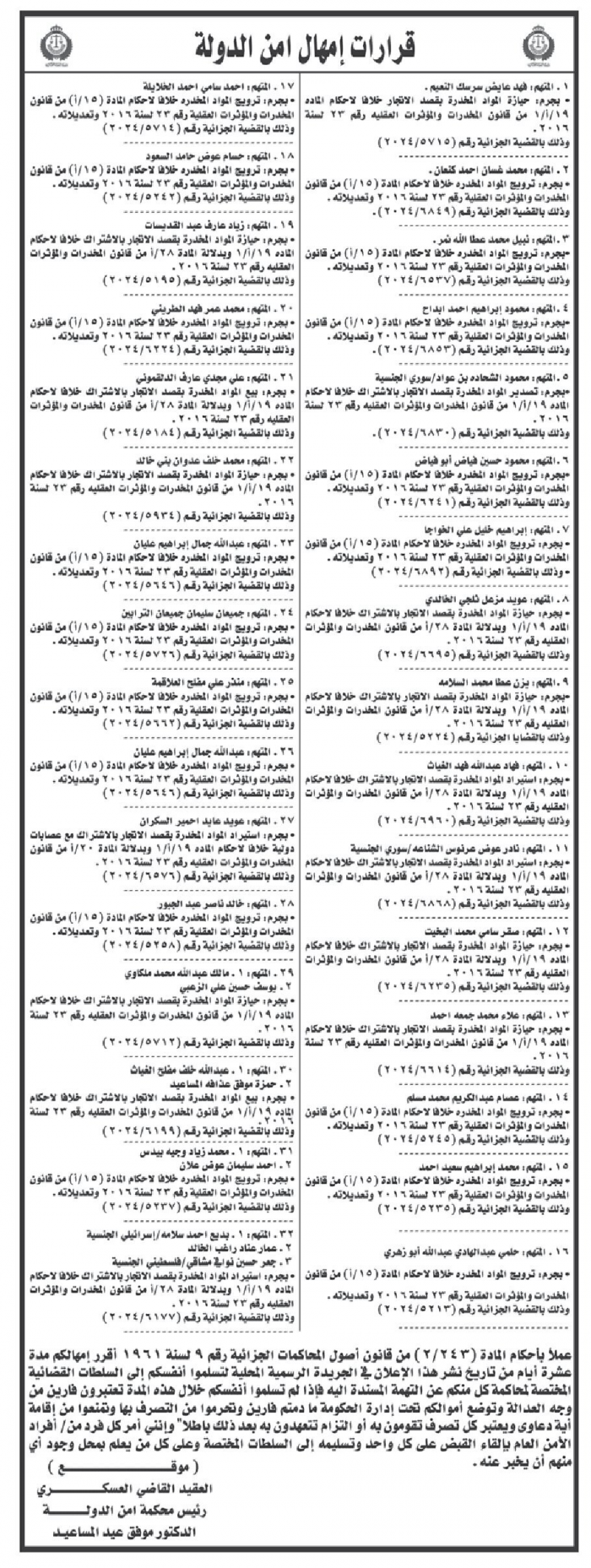 وأضاف القاضي المساعيد: "أوجه أمرًا لكل فرد من أفراد الأمن العام بإلقاء القبض على كل متهم من هؤلاء الـ37 وتسليمهم إلى السلطات المختصة. وأطلب من كل من يعلم بمحل وجود أي منهم أن يُبلغ عنه."