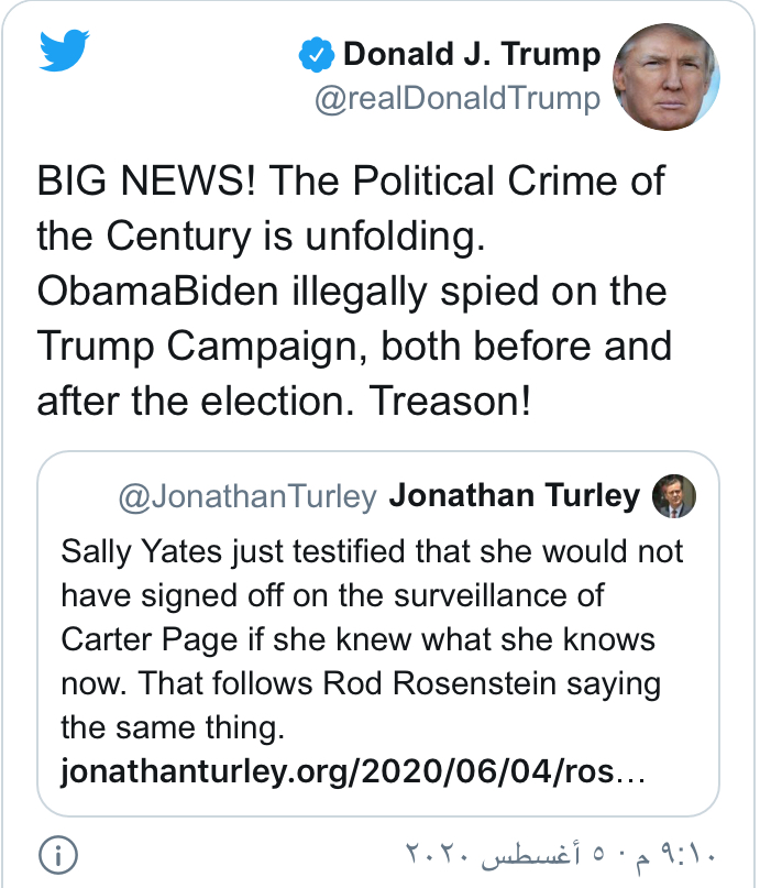 وجاء في تغريدة نشرها ترامب على "تويتر": "أخبار كبيرة، بدأت جريمة القرن السياسية تتكشف، أوباما وبايدن تجسسا بشكل غير قانوني على حملتي الانتخابية، قبل الانتخابات وبعدها، إنها خيانة".
