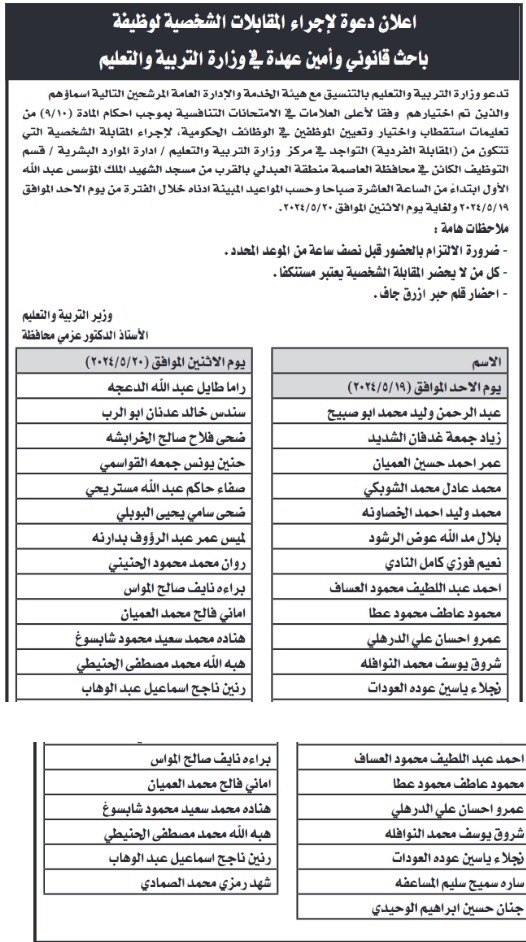 دعت وزارة التربية والتعليم بالتنسيق مع هيئة الخدمة والإدارة العامة المرشحين التالية أسماؤهم لإجراء المقابلة الشخصية.
