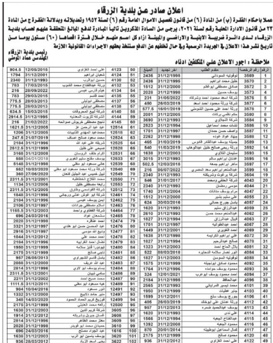 دعت بلدية الزرقاء التالية اسماؤهم المبادرة لدفع المبالغ المتحققة عليهم لحساب البلدية لدى دائرة ضريبة الأبنية والأراضي، خلال فترة اقصاها 60 يوما من تاريخ نشر الاعلان في الجريدة الرسمية.وأفادت البلدية أنه وعملا بأحكام الفقرة (ب) من المادة 6 من قانون تحصيل الأموال العامة رقم 6 لسنة 1952 وتعديلاته، وبدلالة الفقرة (ج) من المادة 23 من قانون الادارة المحلية لسنة 2021، سيتم اتخاذ الاجراءات القانونية اللازمة بحق المتخلفين.