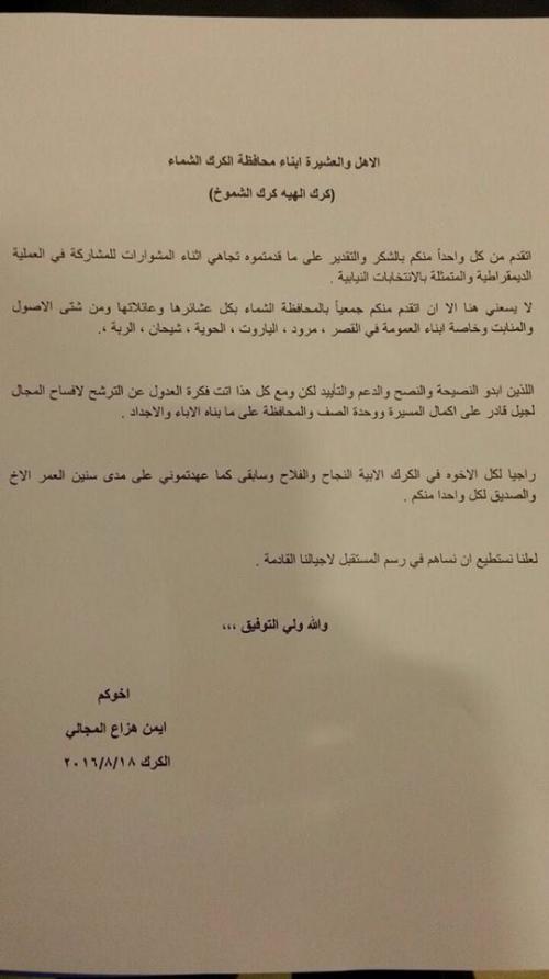 قال الوزير الأسبق النائب ايمن المجالي ان البيان المتداول اليوم عبر مواقع التواصل الاجتماعي اليوم بعدم رغبته للترشح للانتخابات المقبلة قديم ويعود لعام ٢٠١٦ .