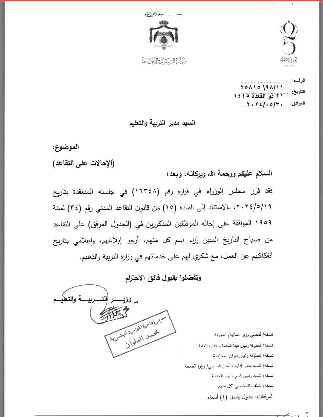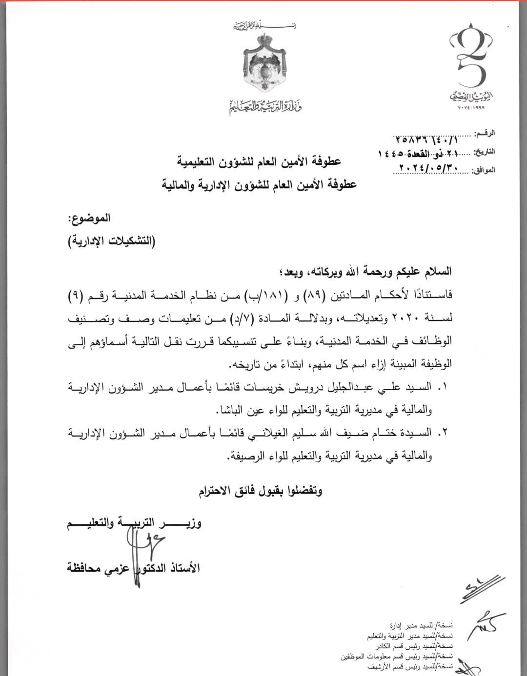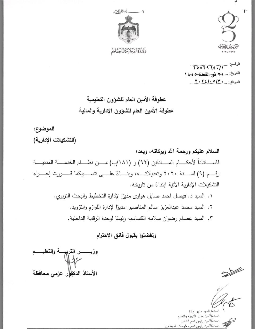 عاجل - تشكيلات إدارية وإحالات على التقاعد في التربية (أسماء)