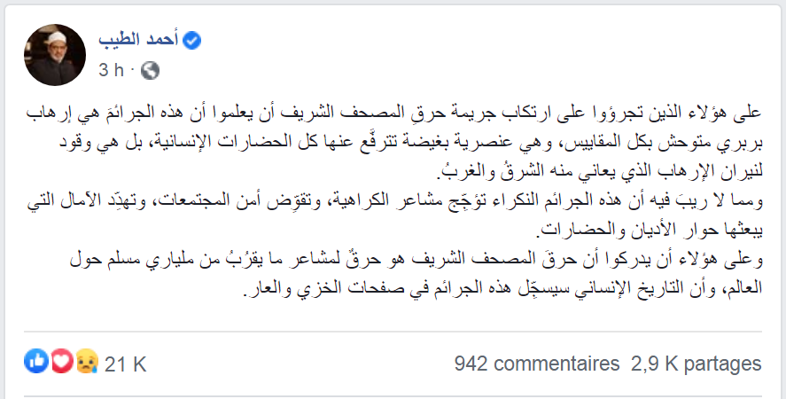 وصف شيخ الأزهر الدكتور أحمد الطيب، واقعة إحراق القرآن في السويد بأنها جريمة إرهابية بربرية، وأنها أحد الأفعال العنصرية.وقال الإمام الأكبر في منشور عبر صفحته الرسمية على موقع "فيسبوك": "على هؤلاء الذين تجرؤوا على ارتكاب جريمة حرقِ المصحف الشريف أن يعلموا أن هذه الجرائم هي إرهاب بربري متوحش بكل المقاييس".