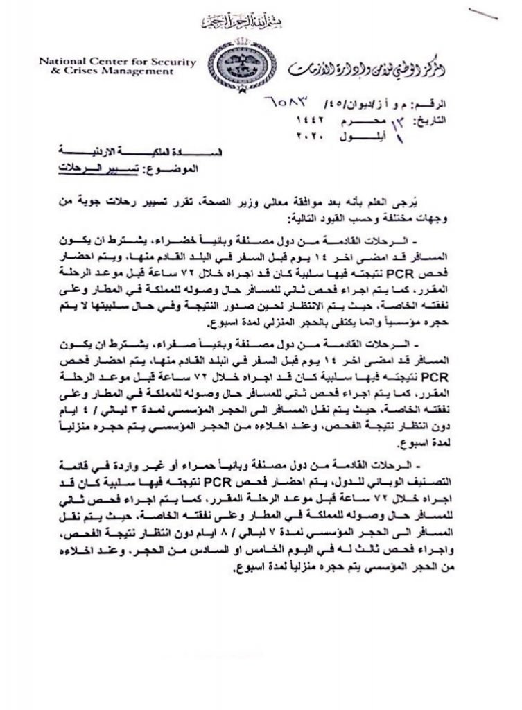 أعد المركز الوطني لإدارة الأزمات معايير جديدة لاستقبال القادمين للمملكة من الخارج، في خطوة يبدو أنها تمهد لإعادة فتح المطار الذي قالت إن المتوقع أن يتم في منتصف الشهر الحالي.