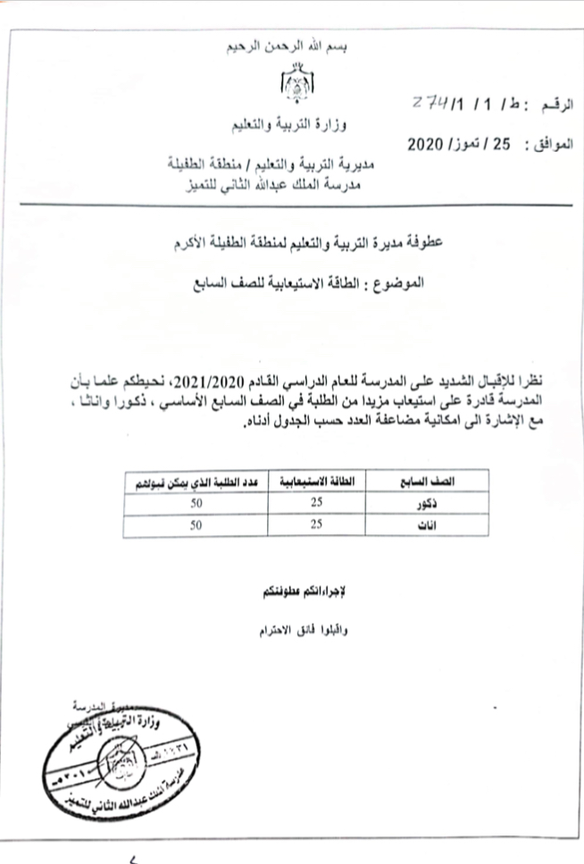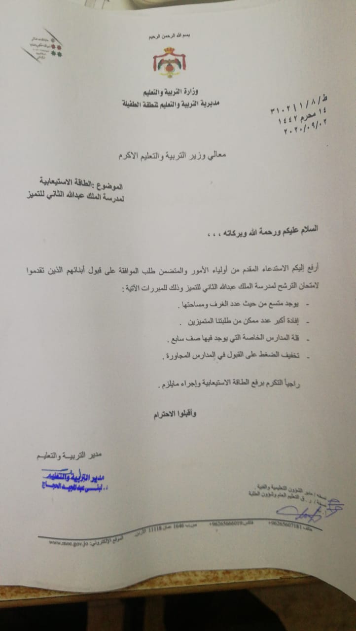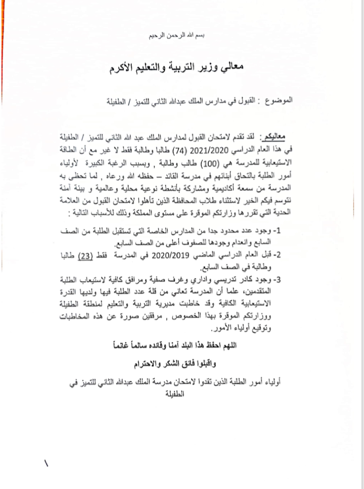 ناشد عدد من أهالي الطفيلة وزير التربية والتعليم الدكتور تيسير النعيمي للإيعاز لمن يلزم لقبول ابنائهم في مدرسة الملك عبدالله الثاني للتميز علما ان الطاقة الاستيعابية تسمح بذلك وحصلت بلكي نيوز على وثيقة تبين تنسيب مدير التربية بالموافقة :