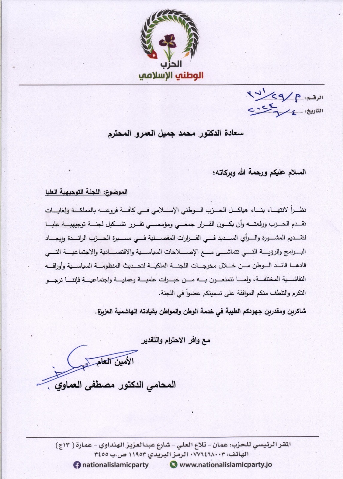 أعلن السياسي والبرلماني المخضرم الدكتور محمد جميل العمرو انضمامه للحزب الوطني الإسلامي، خلال لقاء جمعه مع أمين عام الحزب الدكتور مصطفى العماوي وعدد من قيادات الحزب.