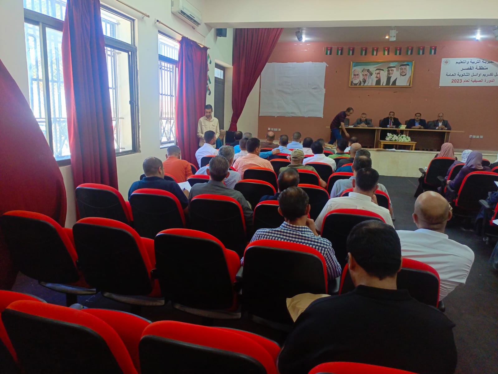 ترأس مدير التربية والتعليم لمنطقة القصر الدكتور علي الفقرا ، اجتماع رؤساء قاعات امتحان الثانوية العامة ومساعديهم/ للدورة الصيفية للعام الدراسي 2024 بحضور لجنة الامتحانات بالمديرية والمكونة من المدراء المختصين واقسام الامتحانات والرقابة وذلك في مدرسة عبد الوهاب المجالي الثانوية للبنين.