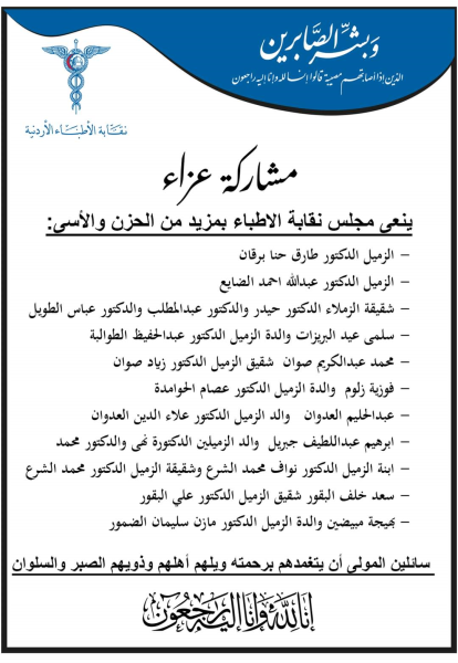 نعى مجلس نقابة الأطباء، عبر صفحات النقابة في مواقع التواصل الاجتماعي، طبيبين من الهيئة العامة للنقابة، وافتهم المنية مؤخرا.كما نعى مجلس نقابة الأطباء عددا من أقارب الهيئة العامة.
