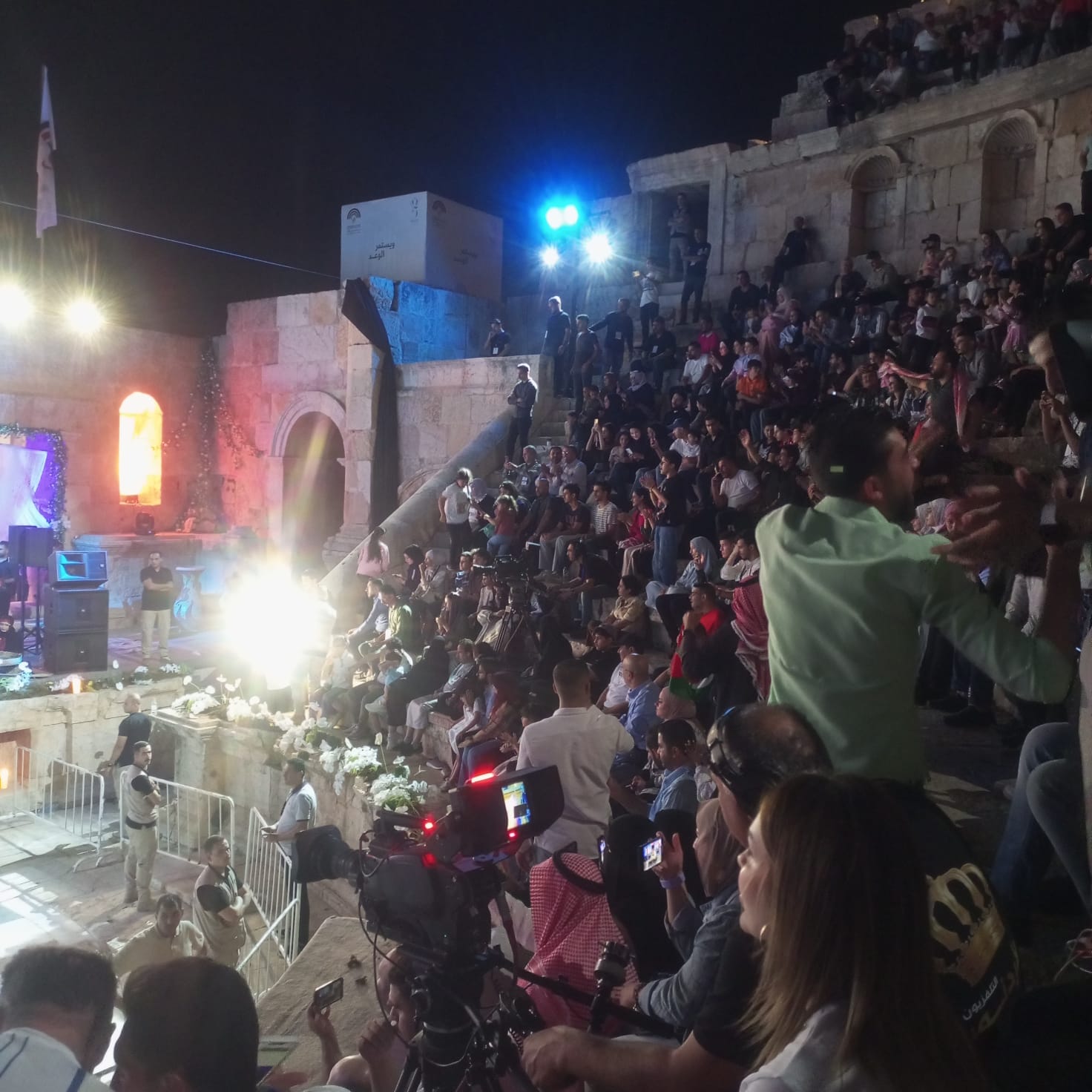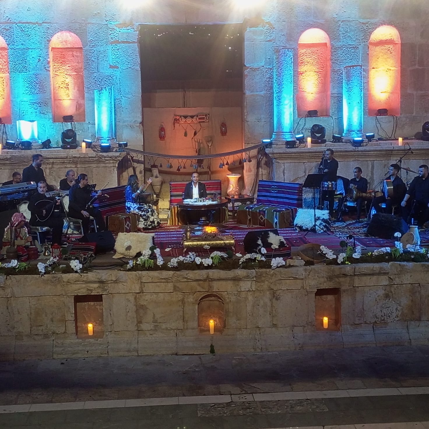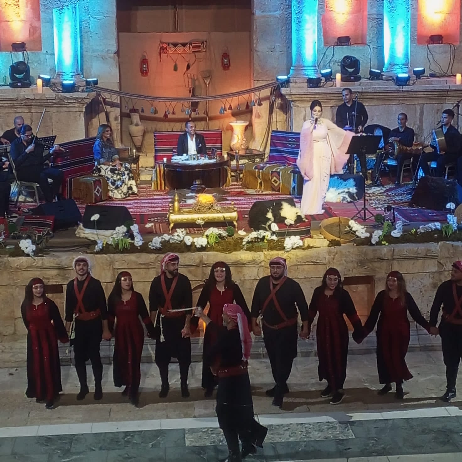 جمال عقل_ بدأت السهرة من خلال التواجد في بيئة تراثية اقيمت على المسرح الشمالي بحوارية غنائية قصيرة بين الفنان علي الديك والفنانة ديانا كرزون وبدأتها ديانا بأغنية بالله تصبوا هالقهوة وزيدوها هيل وبعدها اغنية راسك بالعالي مرفوع الهامة بمصاحبة فرقة الدبكة وانتقلت بعدها إلى أغنية موجهة لفلسطين انا وقت الجد .. وأغنية حنا كبار البلد وهدي يابحر هدي