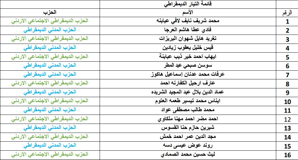أعلن تحالف "التيارُ الديمقراطي"ّ الذي يضم الحزبين " الديمقراطي الاجتماعي الأردني " و "المدني الديمقراطي الأردني"، تسجيل قائمته العامة لدى الهيئة المستقلة للانتخابات هذا الصباح، وتكوّنت القائمةُ من ثمانيةٍ وعشرين عضواً؛