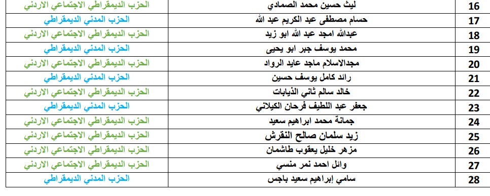 وللمقعد الثاني؛ المحامي فادي العرجا ويحمل شهادةَ الدكتوراة في القانون، ومستشار قانوني لمجلس عشائر جبل الخليل ومرشح سابق للانتخابات النيابية في الزرقاء؛ وناشط سياسي ونقابي مجتمعي معروف.