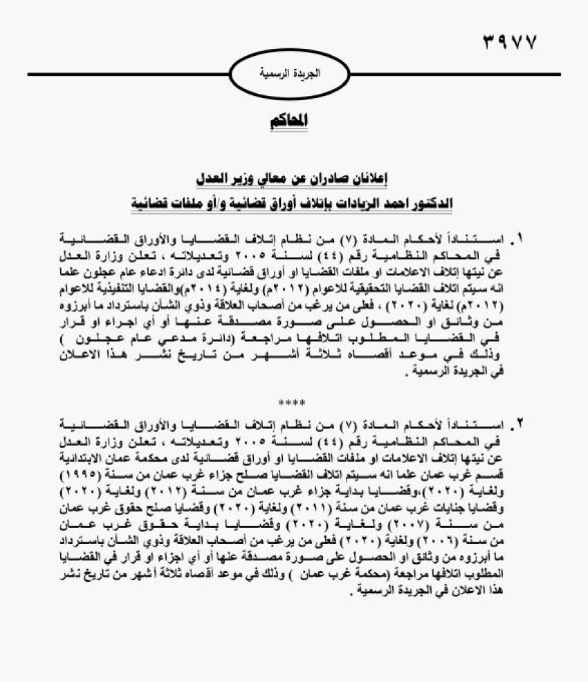 أعلن وزير العدل الدكتور احمد زيادات عن إتلاف أوراق قضائية في محاكم بعمان وعجلون.ووفق ما ورد في الجريدة الرسمية فإن الراغبين باسترداد أي وثائق عليهم مراجعة المحكمة المختصة