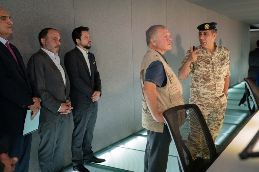 اشاد جلالة الملك عبدالله الثاني، خلال زيارة إلى المركز الوطني للأمن وإدارة الأزمات يرافقه سمو الأمير الحسين بن عبدالله الثاني، ولي العهد، بالتطور الذي يشهده المركز وبجهود العاملين فيه بالتعامل مع مختلف الأزمات بكفاءة عالية