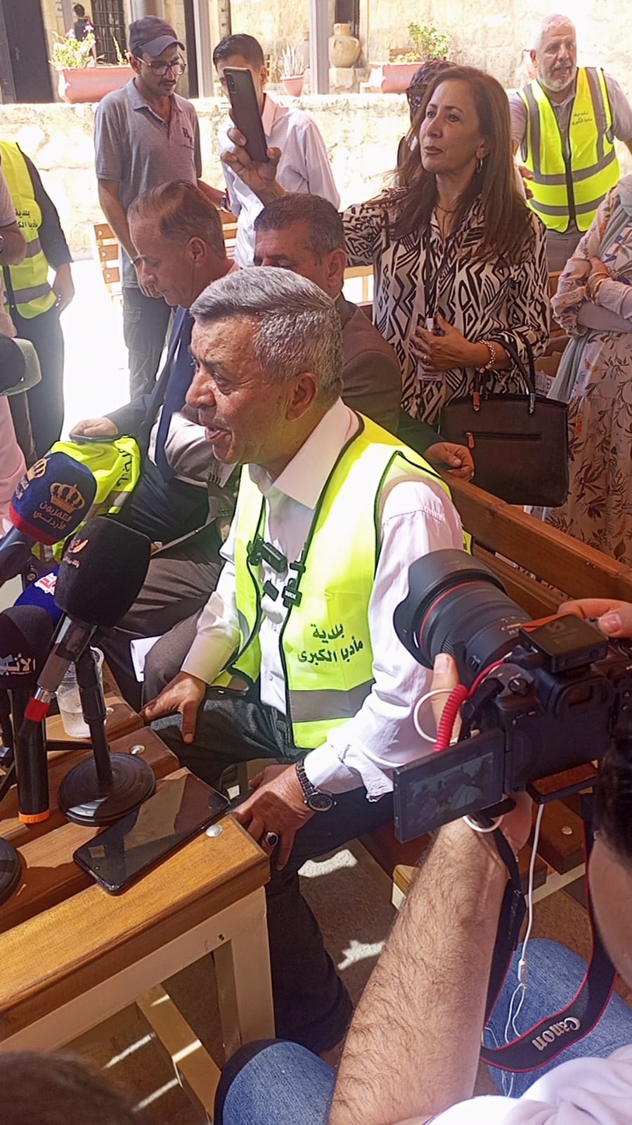 اصطحب اليوم معالي وزير التواصل الحكومي د. مهند المبيضين عدد من الصحفيين والمؤسسات الإعلامية في جولة لمحافظة مادبا للاطلاع على المواقع السياحية فيها بصحبة محافظ مادبا ورئيس البلدية إضافة إلى رئيس مجلس المحافظة ومدير السياحة فيها حيث تحدثوا عن الأهمية السياحية لمنطقة مادبا والمشاريع التي تم إنجازها وما هي الرؤية المستقبلية للعمل على تطوير المرافق السياحية فيها .ومن ثم قاموا بجولة ميدانية لعدد من المواقع السياحية والاستماع إلى شروحات تفصيلية من القائمين عليها مثل شارع الربط السياحي ، مركز الزوار ، معهد فن وترميم الفسيفساء ، الشارع السياحي وقصر المحترق وكنيسة الخارطة ، السوق الريفي الذي يتبع لبلدية مادبا ، وجبل نيبو ونهاية المطاف متحف الحياة .