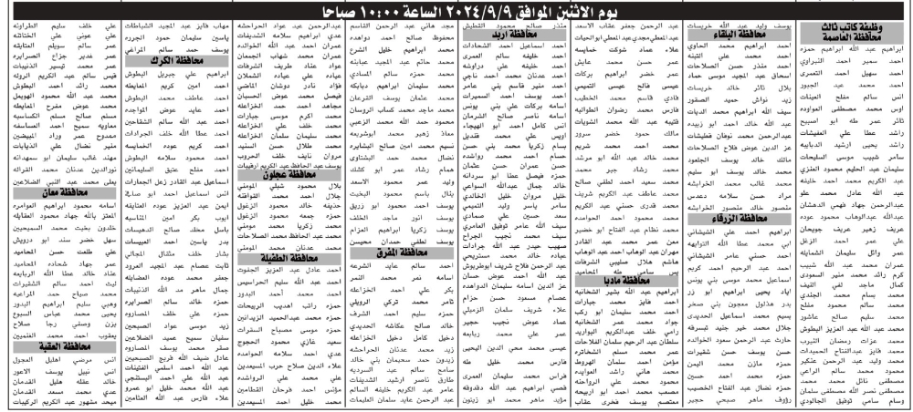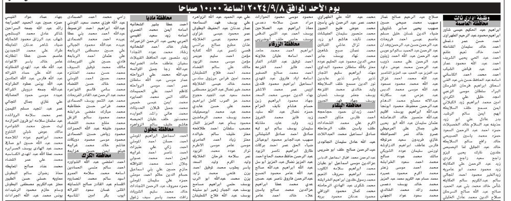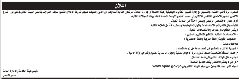 دعت دائرة قاضي القضاة اليوم الثلاثاء وبالتنسيق مع إدارة تقييم الكفايات الوظيفية/هيئة الخدمة والإدارة العامة مرشحين لحضور الامتحان التنافسي الإلكتروني حسب الأوقات والأيام المحددة أدناه. وتاليا الأسماء: