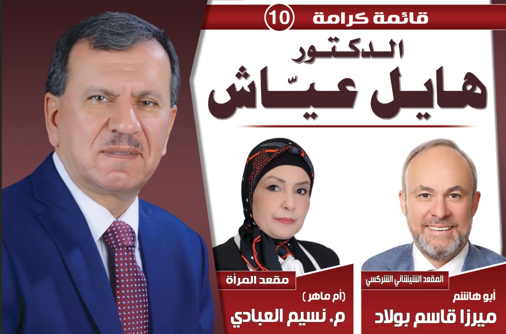 أبناء محافظة الزرقاء الأبية الأهل والعزوه والعشيرة يتقدم مجلس عشائر جبل الخليل في الأردن بتقديم تحية الاخلاص والوفاء لشعبنا الاردني وقيادته الهاشمية الحكيمة .وأننا نتطلع إليكم اليوم بدعمكم لمرشح إجماع مجلس عشائر جبل الخليل سعادة الأخ شريف عدنان ودعم ومؤازرة الكوتات الانتخابية لقائمة كرامة التي يمثل المرشح الاستاذ شريف عدنان فيها مجلس عشائر جبل الخليل وهم أصحاب السعادة : ١.سعادة المهندسة نسيم العبادي - مقعد المرأة ٢.سعادة الدكتور هايل عياش ـ المقعد المسيحي ٣. سعادة الأستاذ ميرزا بولاد ـ المقعد الشيشاني والشركسي. معاهدين الله لهذا الوطن عهد قيادته الهاشمية الحكيمة لأبناء شعبه بأن يظل عزيزا كريما آمنا مطمئنا مستقرا .ـ رئيس مجلس عشائر جبل الخليل .سعادة ا. مجاهد صبري طنينه الهيئة الاستشارية العليا لمجلس عشائر جبل الخليل ـ اللجنة الانتخابية المركزية العليا لمجلس عشائر جبل الخليل/ محافظة الزرقاء الخميس ٥/ ٩/ ٢٠٢٤