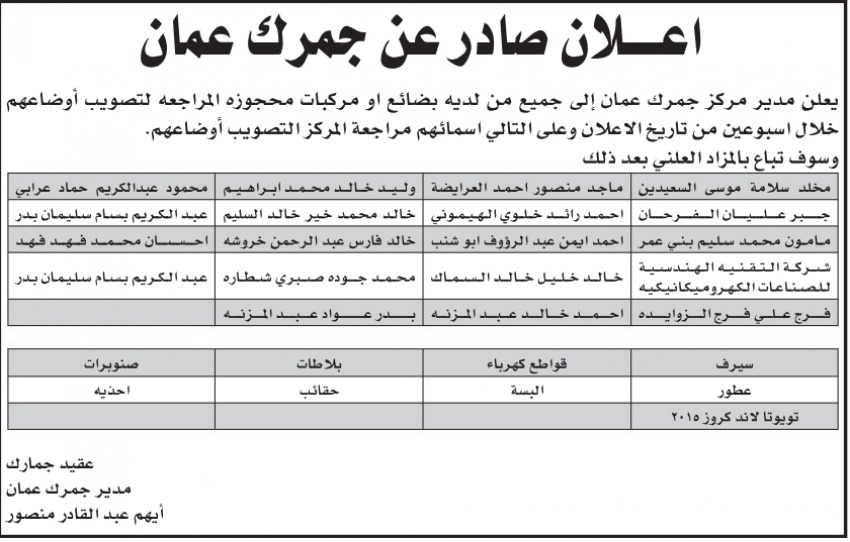 أعلن مركز جمرك عمان عن أسماء ممن لديهم بضائع ومركبات محجوزة لدى المركز، ضرورة مراجعة المركز لتصويب أوضاعهم. وأوضح المركز في اعلان منشور بالصحف اليومية الصادرة اليوم الاحد، أن مدة تصويب الأوضاع ستكون لأسبوعين من تاريخ الإعلان وإلا سيتم طرح البضاعة في المزاد العلني. وتاليا الأسماء والتفاصيل: