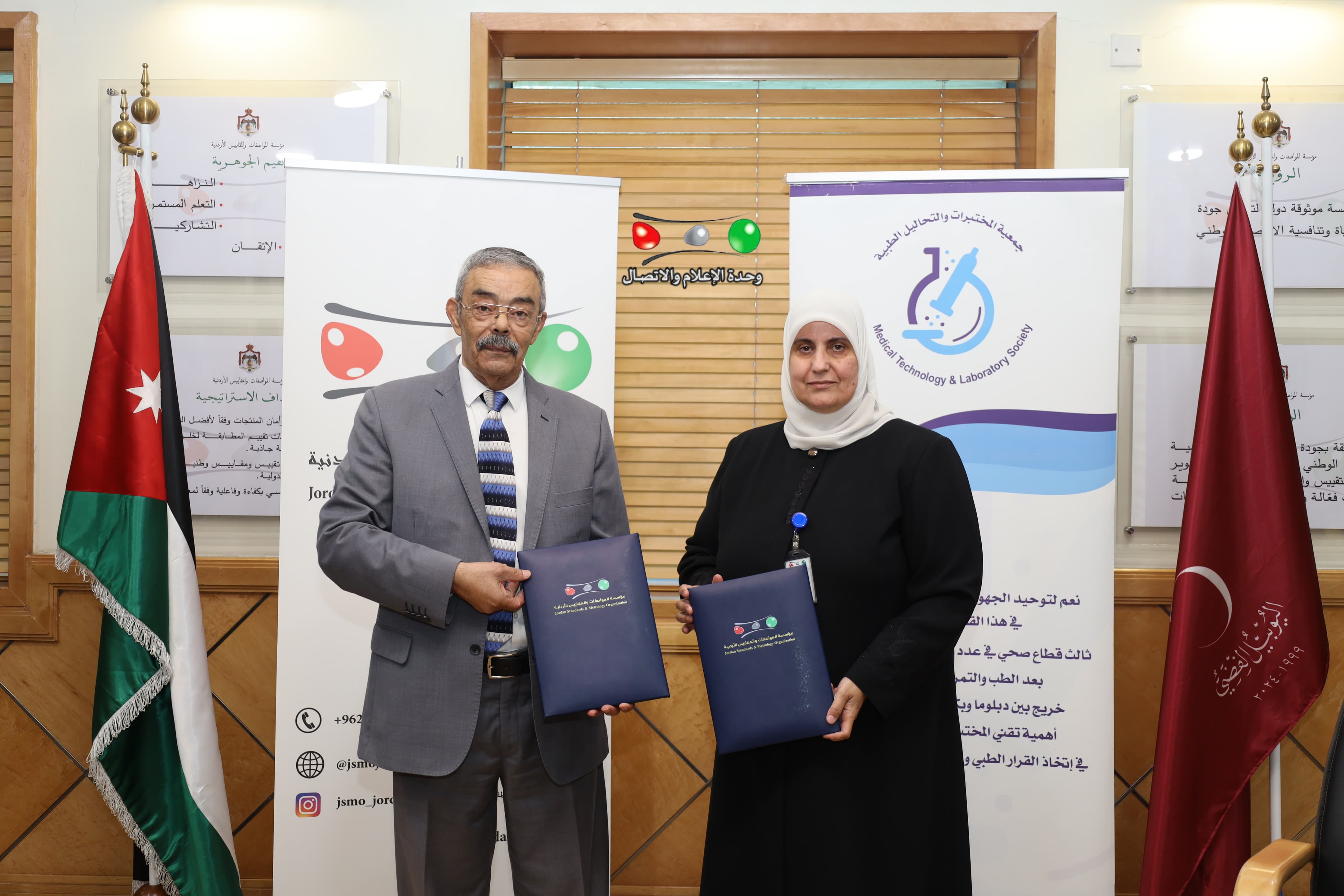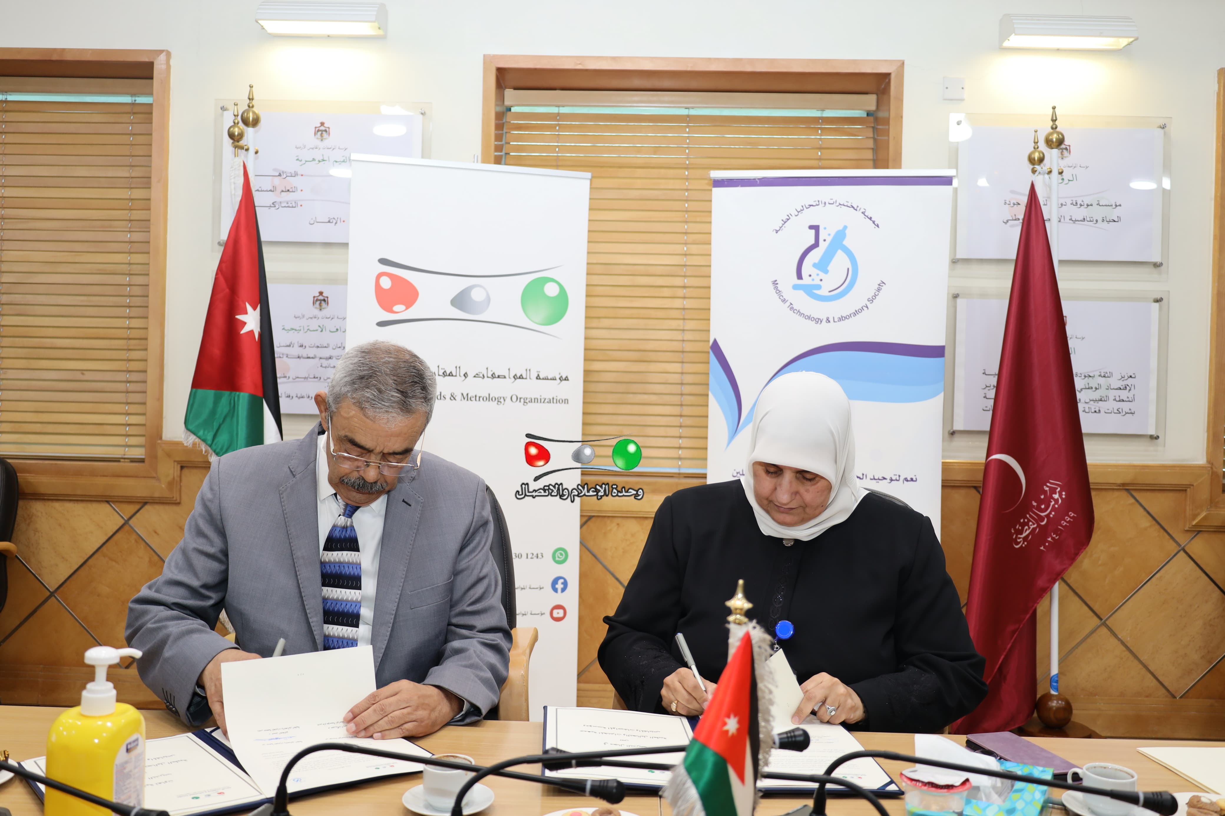 وقعت في مؤسسة المواصفات والمقاييس اليوم الأحد اتفاقية تعاون بين المؤسسة وجمعية المختبرات والتحاليل الطبية في مجال التدريب؛ وذلك لنقل المعرفة ورفع مستوى الخدمات الصحية المقدمة للمواطنين. وقالت مدير عام المؤسسة المهندسة عبير بركات الزهير إن توقيع هذه الاتفاقية يأتي لدرايتنا بأهمية المختبرات الطبية في منظومة الرعاية الصحية، والتي تعتبر “عين الطبيب” الذي يعتمد عليه في تشخيص العديد من الأمراض والمشاكل الصحية.وأضافت المهندسة الزّهير إنّ المؤسسة وكوادرها الفنيّة والتّدريبيّة، لديها المعرفة والخبرة الكافية في مجال تطوير ورفع مستوى الجودة والكفاءة في عمل المختبرات الطبية، وحسب المواصفات الصادرة عن منظمة التقييس الدولية "الايزو" وبالأخص المواصفة ايزو 15189، بالإضافة إلى خدمات المؤسسة في مجالات المقاييس ومعايرة الأجهزة الطبية والحجوم المخبريّة، وقد ارتأت أن تضع هذه المعارف والخبرات في خدمة العاملين في المختبرات الطبية، وبما يتماشى مع الرؤية الملكية السامية للنهوض بالقطاع الصحي والارتقاء بخدماته وتحسين أدائه لرفع نسبة رضا المواطن.من جانبه أشاد رئيس جمعية المختبرات والتحاليل الطبية الدكتور حسين الحجاوي بالمؤسسة ودورها الوطني في دعم الاقتصاد، وتأهيل وتدريب الكوادر البشرية، إلى جانب الدور الرقابي الواسع، مبيناً أن الجمعية تعتبر بيت خبرة يضم العديد من الكفاءات الوطنية.
