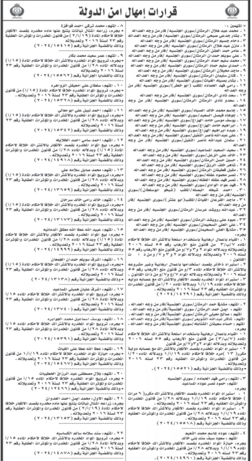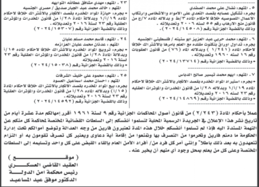 أمهلت محكمة أمن الدولة عدداً من المتهمين فترة 10 أيام، اعتباراً من اليوم الخميس، لتسليم أنفسهم إلى السلطات القضائية المختصة لمواجهة التهم الموجهة إليهم. وفي حال عدم امتثال المتهمين وتسليم أنفسهم خلال هذه المدة، سيتم اعتبارهم فارين من وجه العدالة، وستوضع أموالهم تحت إدارة الحكومة. كما أصدرت المحكمة أوامرها لأفراد الأمن العام بالقبض على كل متهم وتسليمه إلى السلطات المختصة، داعية أي شخص يمتلك معلومات عن مكان تواجد أي منهم للإبلاغ. وفيما يلي الأسماء: