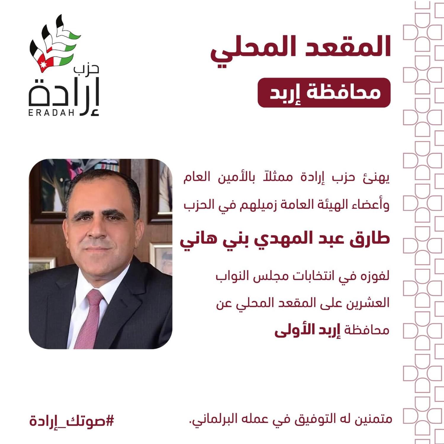 ويعد ذلك - وبالرغم من كل شيء- ثمرةً للجهود الكبيرة التي بذلها الحزب أعضاءا ومناصرين، وهو شهادةً على ثقة الشعب الأردني في رؤيتنا وأهدافنا و برنامج الحزب الذي يتطلّع إلى بناء مستقبل أفضل يليق بكل أردني وأردنية.، وفي هذا السياق، نتوجه في حزب إرادة ببالغ الشكر والتقدير للهيئة العامة وجميع من دعم وناصر الحزب، الذي جاء بناءاً على قناعة بأن الديمقراطية الأردنية هي مسارٌ لا رجعة فيه نحو ترسيخ دولة القانون والمؤسسات.