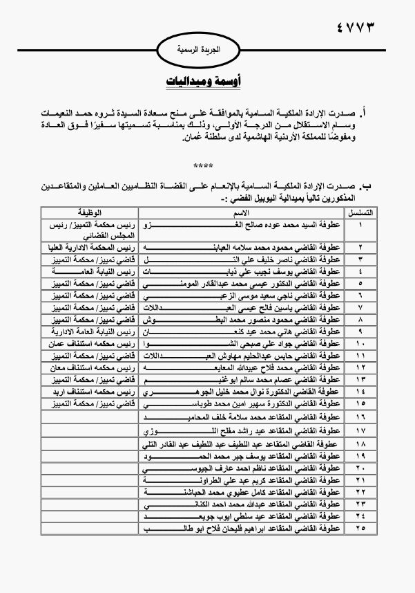 صدرت الارادة الملكية السامية بالموافقة على منح سعادة السيدة ثروة النعيمات وسام الاستقلال من الدرجة الاولى. كما صدرت الارادة الملكية بالانعام على القضاة النظاميين العاملين والمتقاعدين المذكورين تاليا بميدالية اليوبيل الفضي: