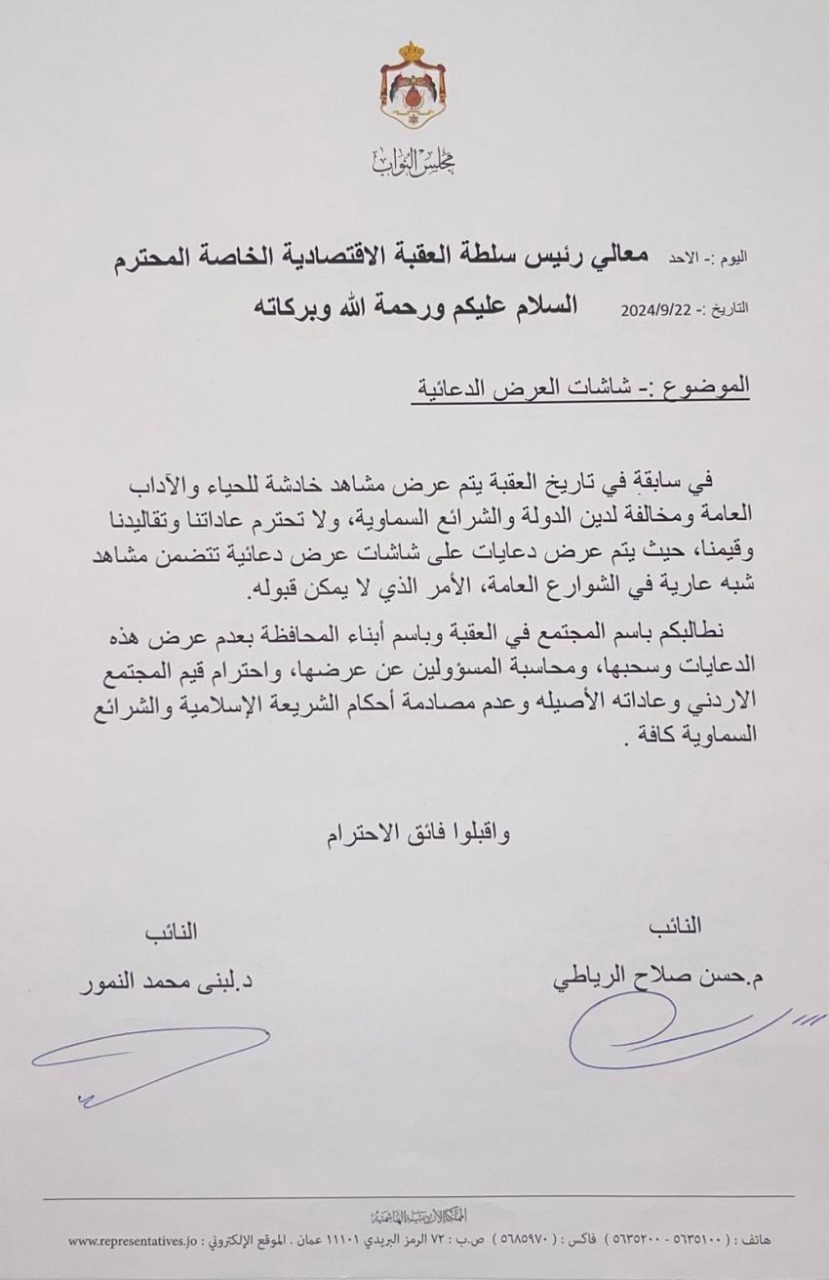 طالب النائبان عن محافظة العقبة، المهندس حسن الرياطي والدكتورة لبنى النمور، رئيس سلطة منطقة العقبة الاقتصادية الخاصة، بإزالة الإعلانات التي تحتوي على مشاهد "شبه عارية" وتخالف الآداب العامة والشريعة الإسلامية من الشوارع العامة فوراً، ومحاسبة المسؤولين عن عرضها. وأكد الرياطي والنمور، في مذكرة اليوم الاثنين، أن هذه التصرفات تعتبر سابقة في تاريخ العقبة، حيث يتم عرض صور دعائية تخالف قيم المجتمع الأردني وأخلاقه على الشاشات المنتشرة في الشوارع. وشددا على ضرورة احترام قيم المجتمع الأردني الأصيلة وعاداته، والامتثال لأحكام الشريعة الإسلامية والشرائع السماوية، حفاظاً على القيم الأخلاقية والدينية في المدينة.