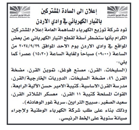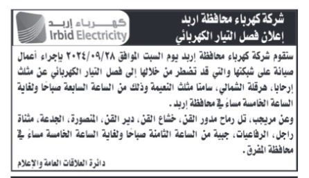 أعلنت شركتا كهرباء إربد وتوزيع الكهرباء عن نيتها فصل التيار الكهربائي عن عدد من المناطق خلال الأسبوع المقبل، وذلك لإجراء عمليات صيانة دورية على الشبكة الكهربائية بهدف تحسين الخدمة وضمان استمراريتها. وفيما يلي تفاصيل المناطق المتأثرة بعمليات فصل التيار الكهربائي والمواعيد المحددة للفصل: