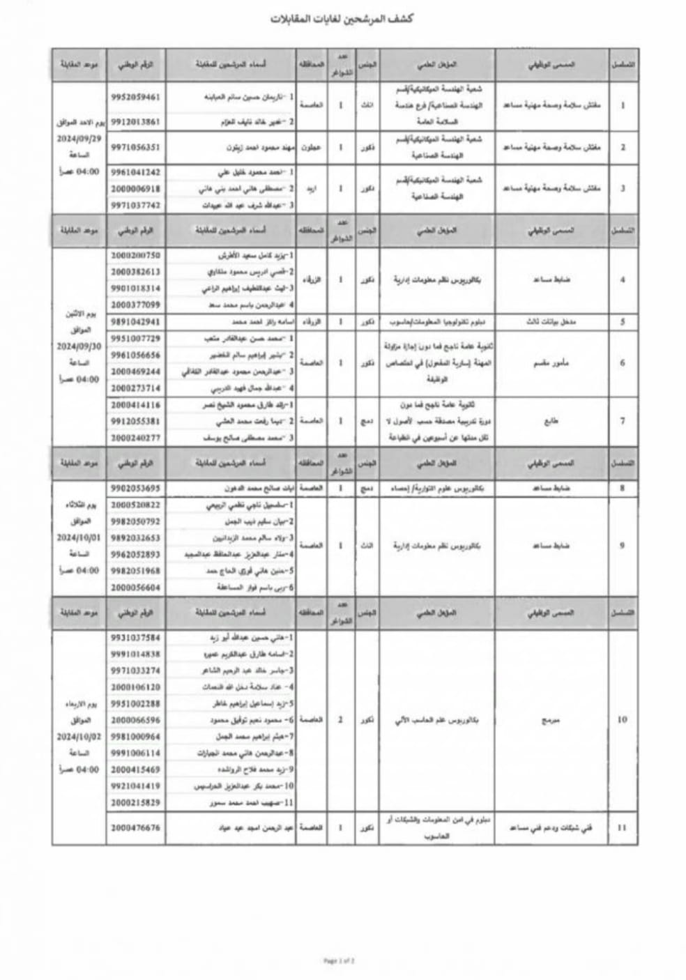 تدعو وزارة العمل التالية أسماؤهم المبينة ادناه لإجراء مقابلة شخصية في مبنى وزارة العمل الكائن في منطقة الدوار السابع – شارع عيسى الناعوري مقابل كوزمو مول وذلك وفقاً للتاريخ المحدد بالجدول ادناه مصطحبين معهم البطاقة الشخصية. وزيارة الموقع الالكتروني لوزارة العمل للاطلاع على موعد المقابلة https: www.mol.gov.jo /defolt/ Ar ملاحظة: الرجاء الحضور قبل الموعد بنصف ساعة وكل من يتخلف عن الحضور لاجراء المقابلة يعتبر مستنكفاً عن التعيين.