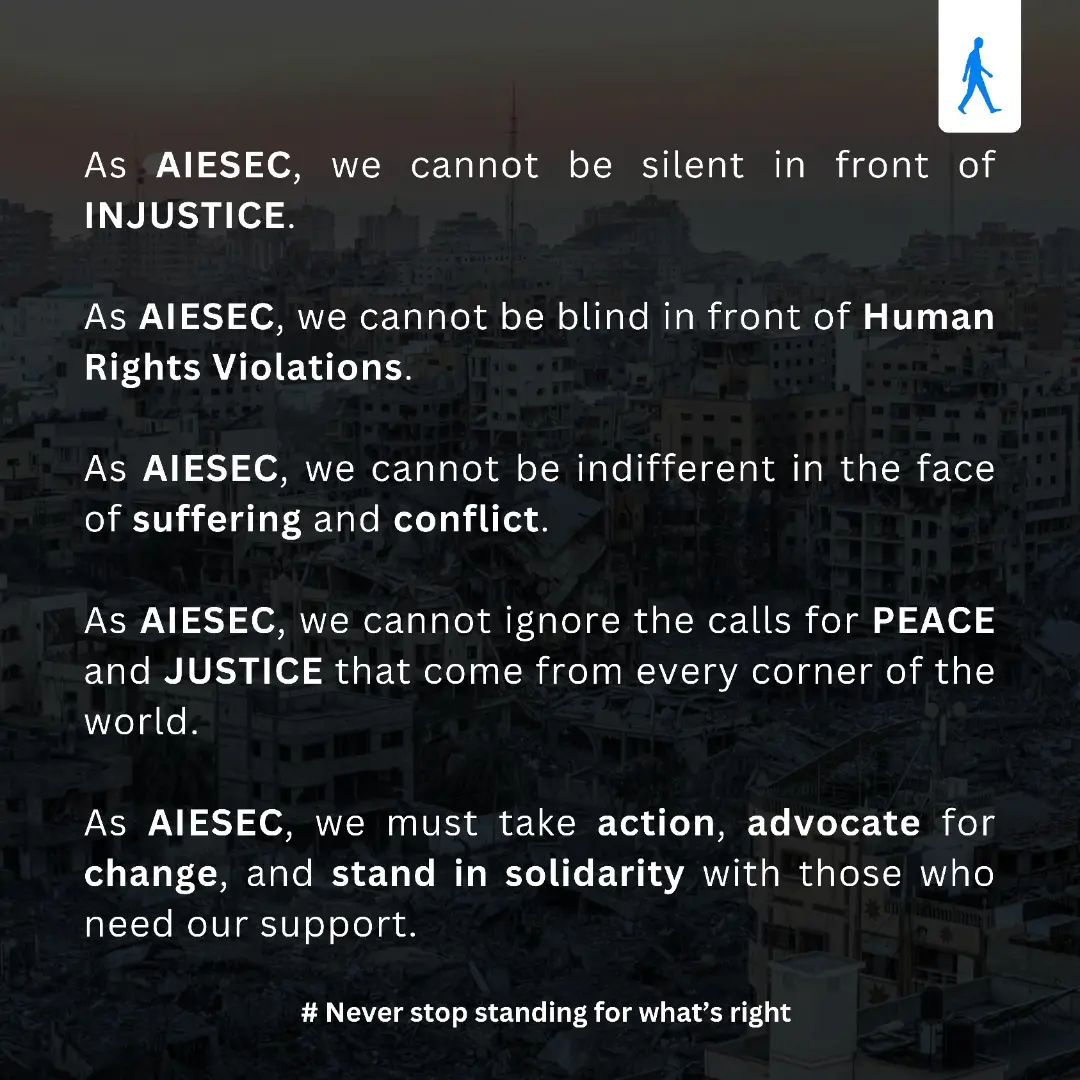 كمنظمة AIESEC في الأردن، ندين جميع أشكال العنف والأثر المدمر على المدنيين. لا ينبغي أن يكون أي نزاع على حساب حياة الأبرياء، ويجب معالجة الانتهاكات المستمرة لحقوق الإنسان. نحن في AIESEC في الأردن نقف مع هؤلاء الأشخاص، ونعبر عن دعمنا العميق لكل من تأثر بهذه الأزمة. نؤمن بعالم تسوده السلام والتفاهم بدلاً من الصراع والانقسام.