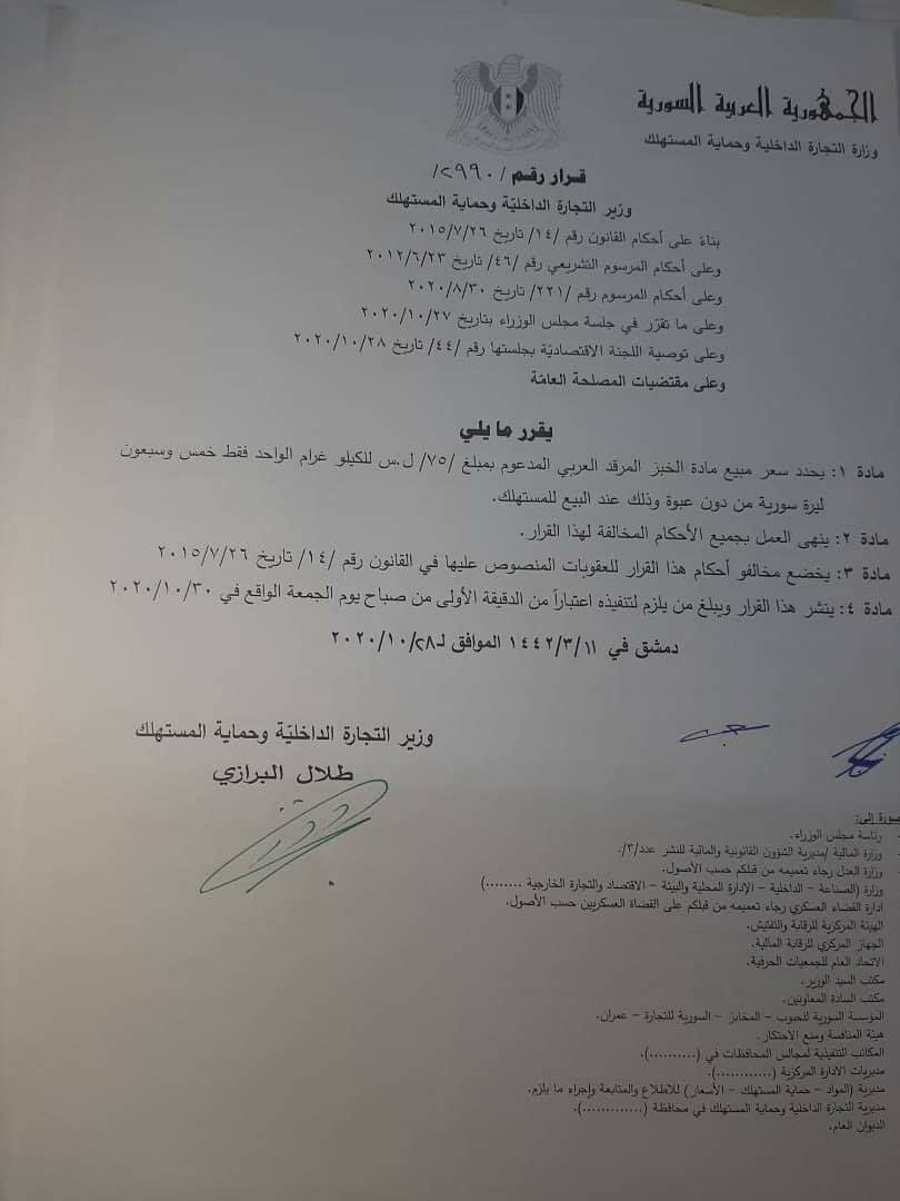 سوريا ترفع سعر الخبز الى الضعف ( وثيقة )