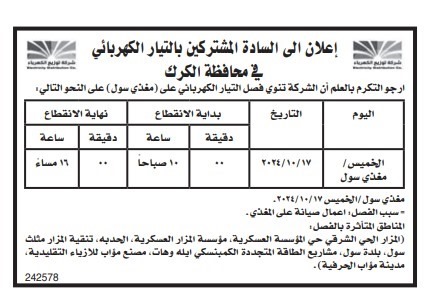 وفيما يلي تفاصيل المناطق والمواعيد المحددة لعمليات فصل التيار الكهربائي: