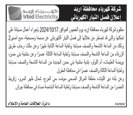 أعلنت شركتا كهرباء إربد وتوزيع الكهرباء عن فصل التيار الكهربائي عن عدد من المناطق الواقعة ضمن نطاق اختصاصها يوم الخميس المقبل، وذلك لإجراء عمليات صيانة دورية على الشبكة الكهربائية. ودعت الشركتان المواطنين في المناطق المتأثرة إلى أخذ الاحتياطات اللازمة خلال فترة الفصل لضمان عدم تأثر أنشطتهم اليومية.