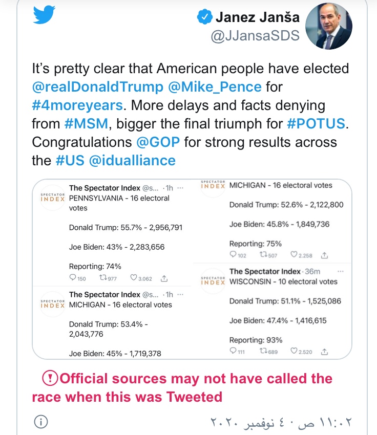 هنأ رئيس الوزراء السلوفيني، يانيز يانشا، الرئيس الأمريكي، دونالد ترامب، بالفوز في الانتخابات، على الرغم من عدم صدور نتائج التصويت النهائية حتى الآن.
